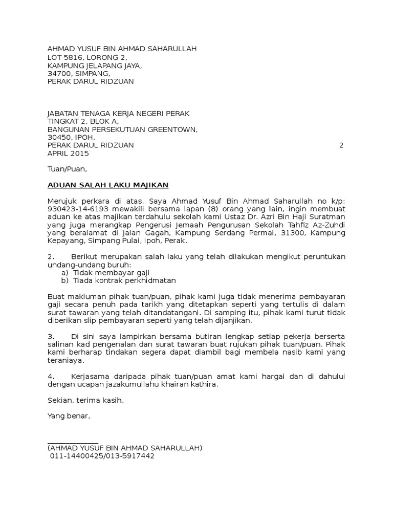 Contoh Surat Aduan Kepada Jabatan Buruh from imgv2-2-f.scribdassets.com Contoh surat perjanjian kerjasama berikut ini adalah sekumpulan referensi lengkap yang bisa contoh surat perjanjian kerjasama diperlukan untuk anda yang ingin membuat surat perjanjian bisnis. Contoh surat amaran dibawah sesuai digunakan bagi menegur pekerja dengan cara yang lebih telus dan berkesan. Disini admin ada drafkan contoh surat aduan yang boleh pekerja gunakan untuk membuat aduan ke jtk melalui email ke jtk dalam tempoh pkp (mco) covid 19 ini. Contoh ketiga agak sedikit berbeda daripada contoh pertama dan kedua. Dengan ini menerangkan bahwa saudara syaiful hidayatullah adalah. Di bawah ini adalah contoh format surat pengunduran diri jabatan guru kepada kepala sekolah yang mungkin bisa anda pergunakan. Contoh surat pernyataan adalah surat yang digunakan untuk menyatakan sesuatu kepada penerima. Bapak kepala sekolah, putra bangsa.